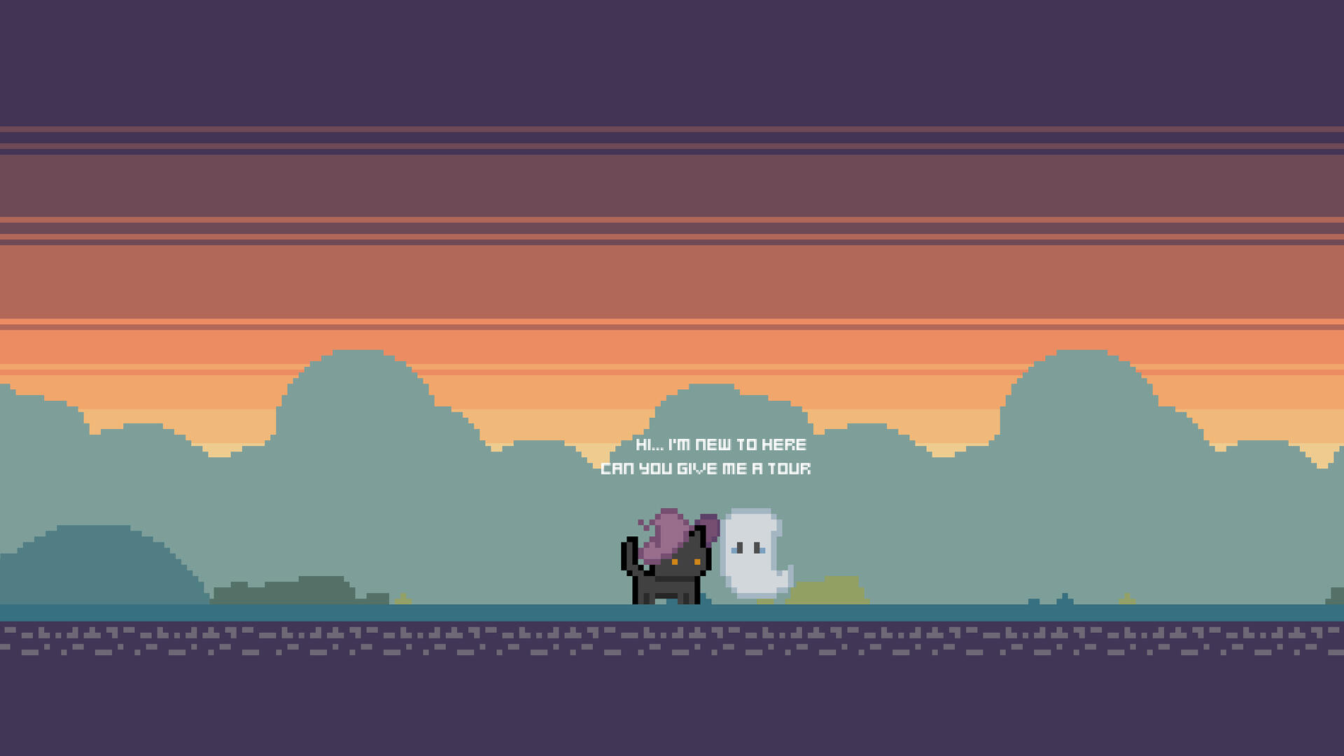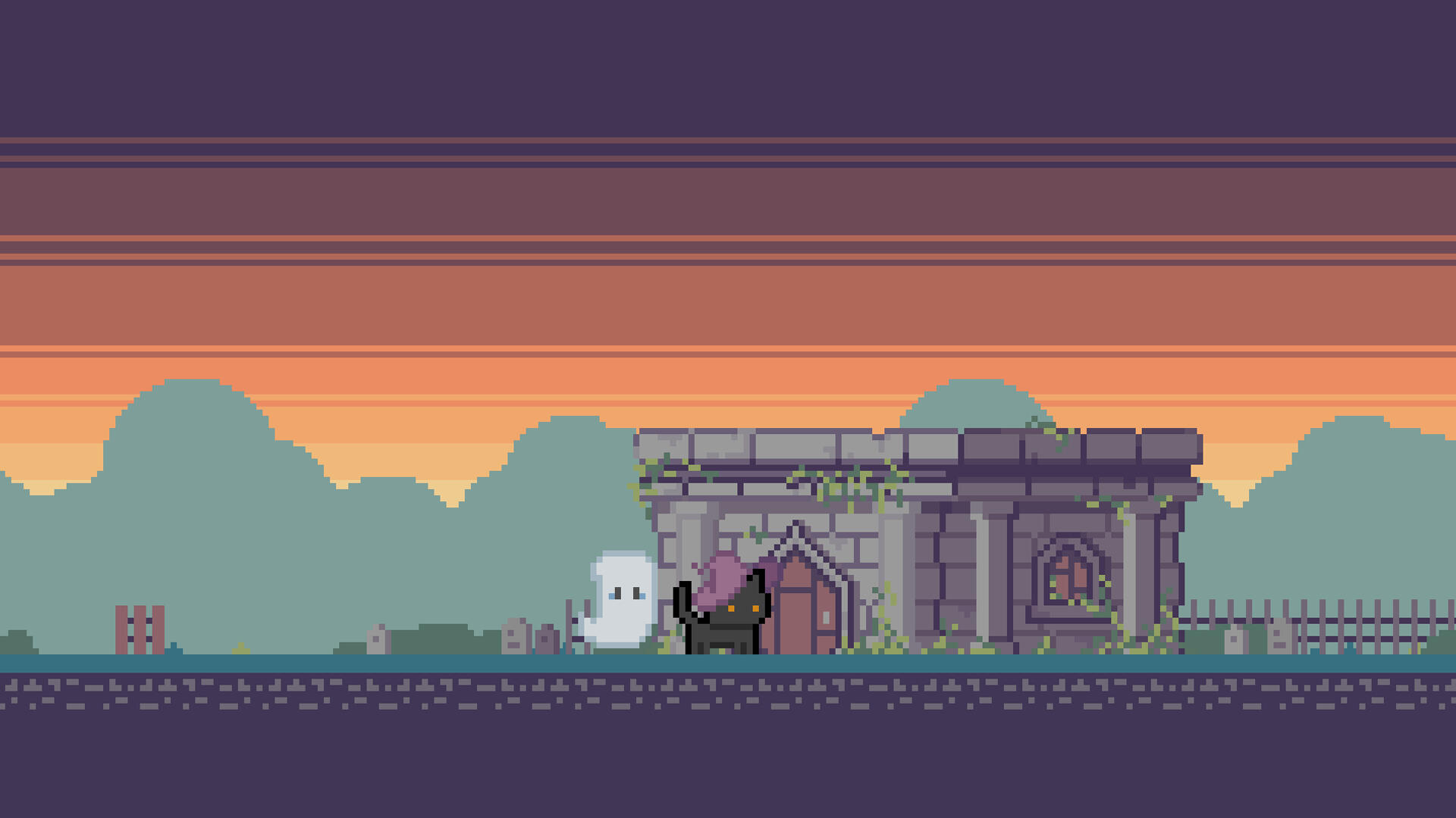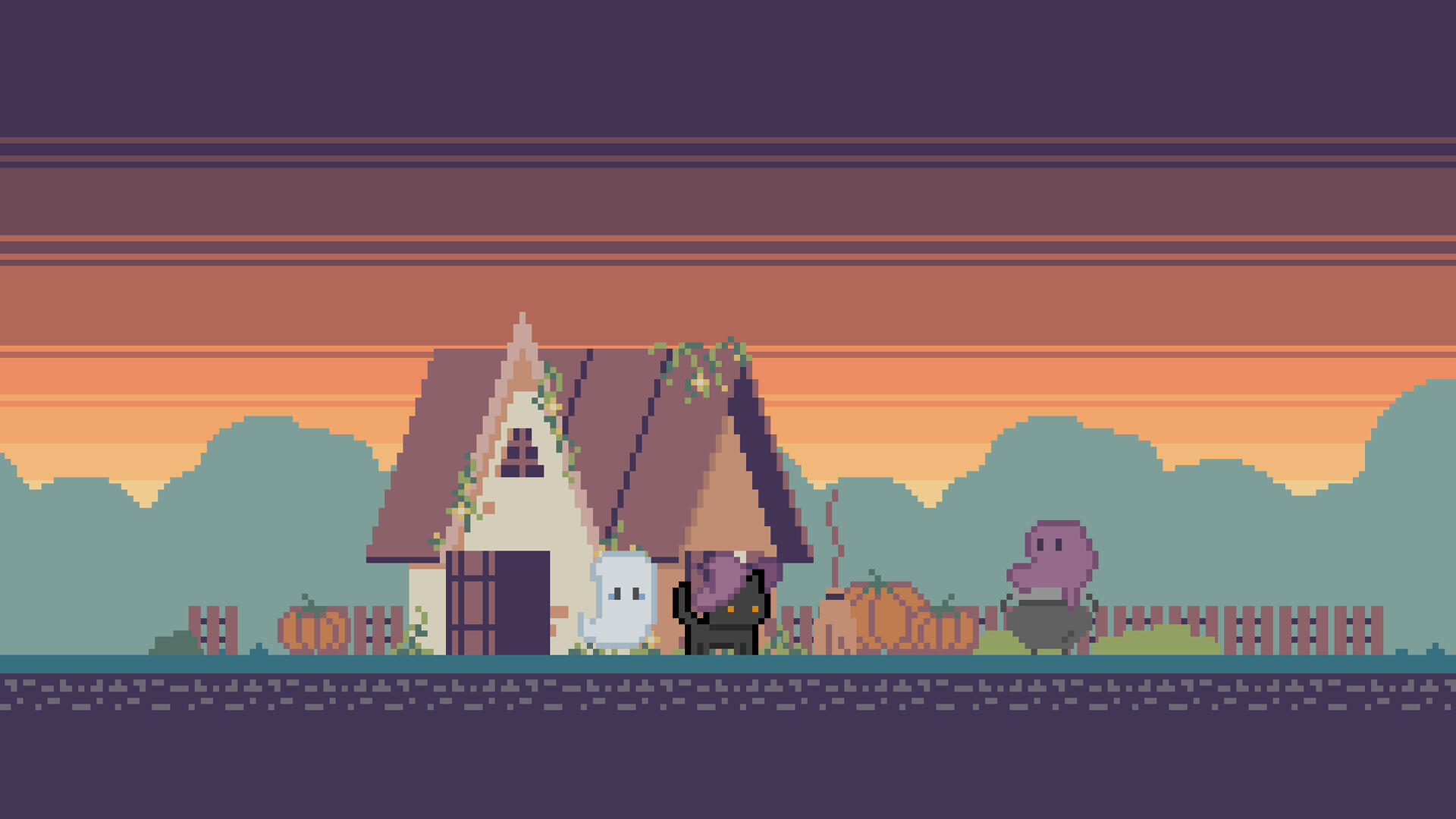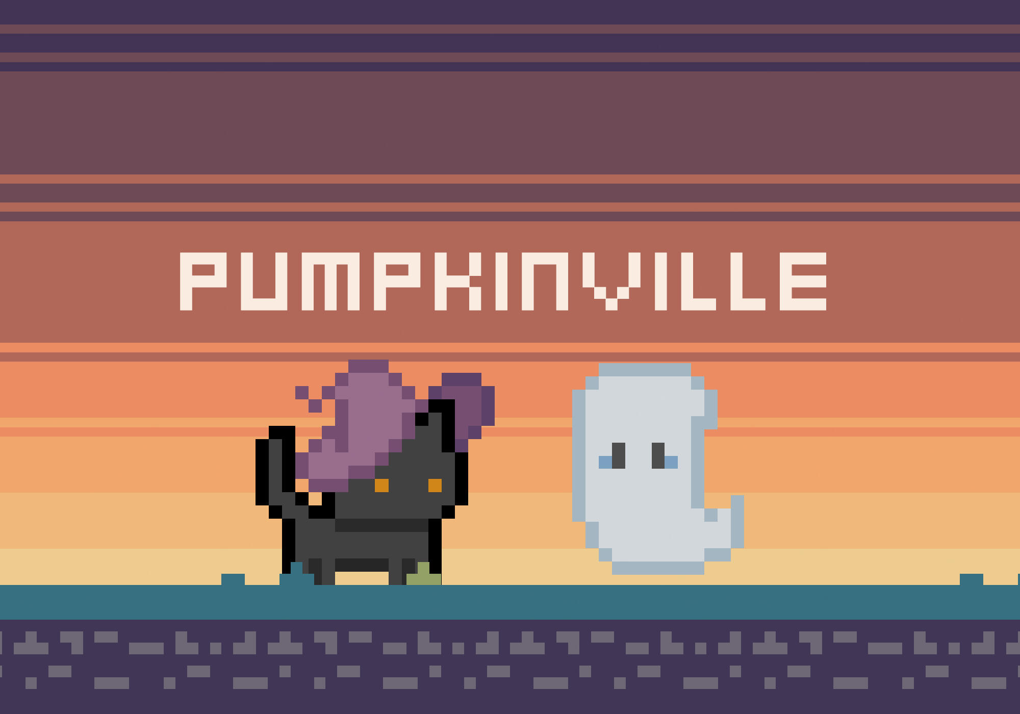 Pumpkinville is a simple pixel-art 2D flat game narrating a black cat witch's encounter with a little ghost in Pumpkinville.Players take on the role of the black cat witch, who guides the newly arrived little ghost on a tour of the village. Together, they explore the town, allowing the ghost to familiarize itself with the surroundings and introducing it to the neighbors.Game Page