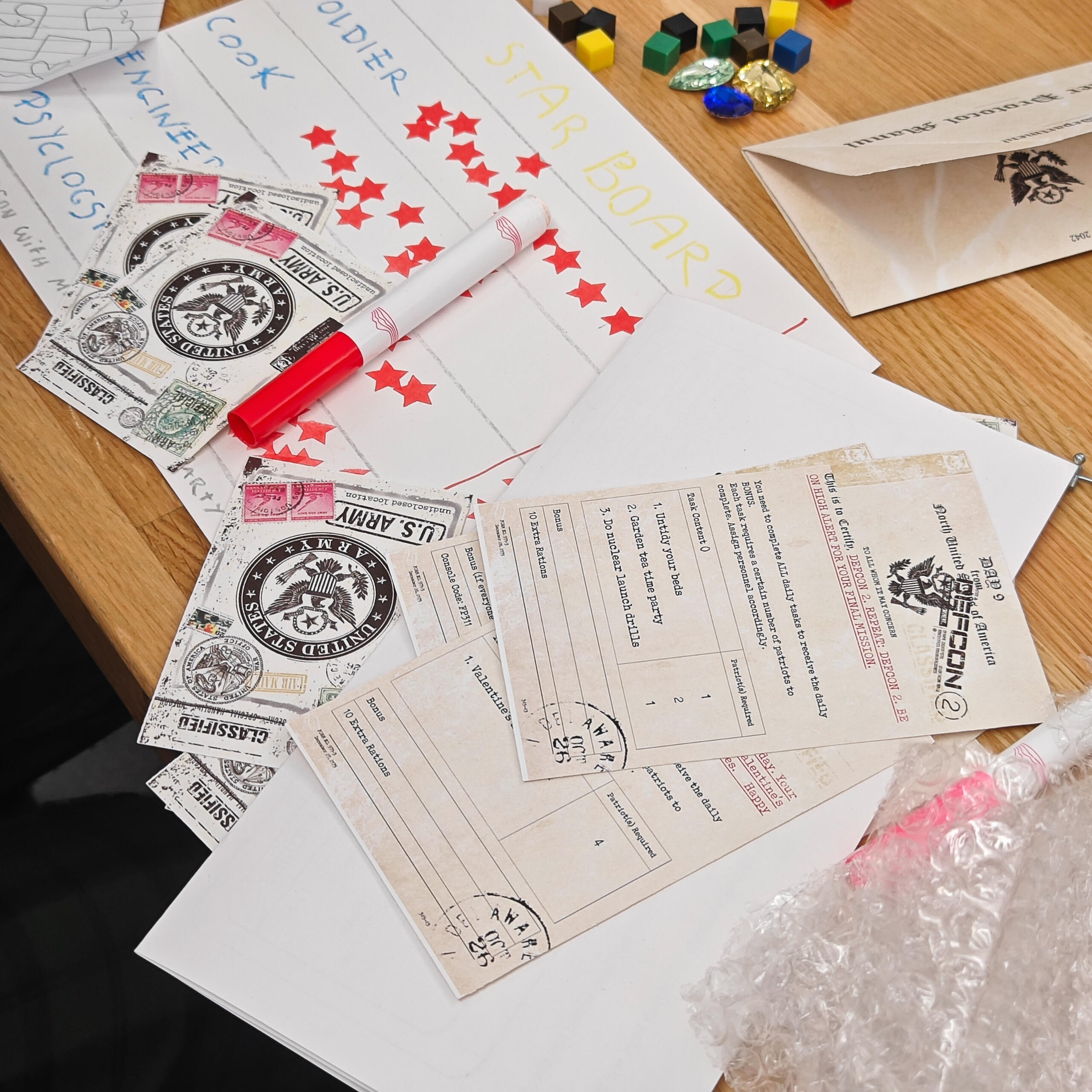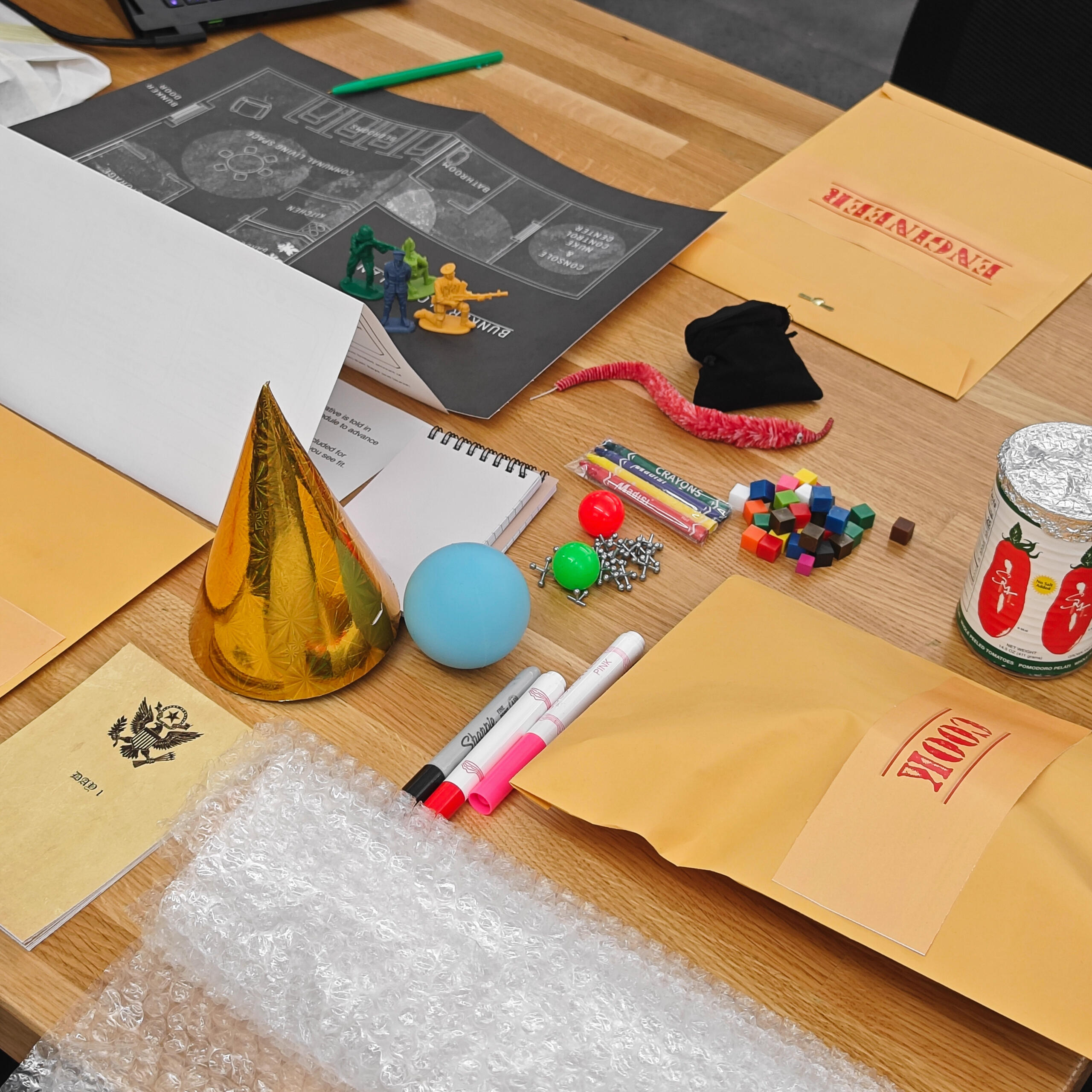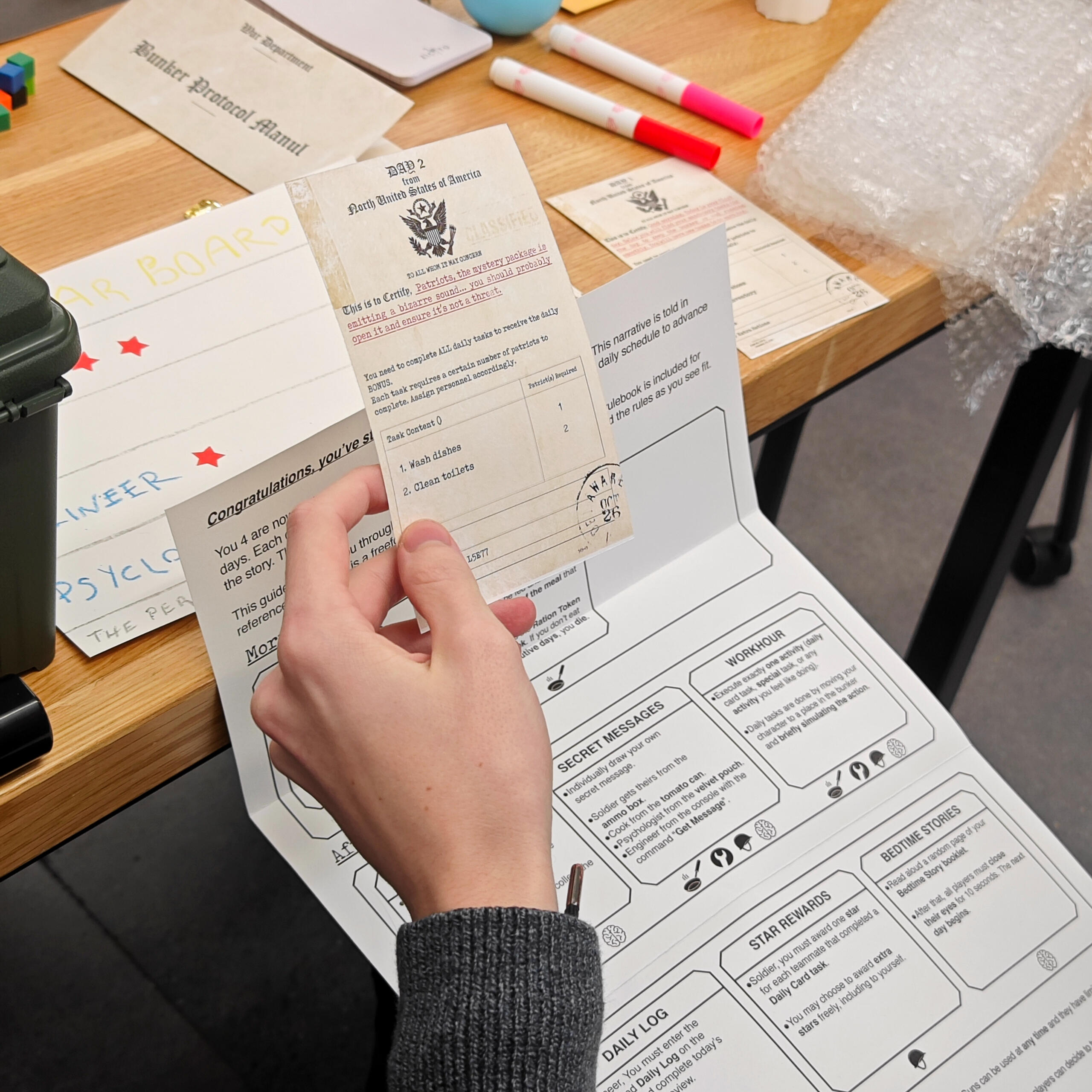 The Game is a cooperative tabletop game offering an immersive role-playing experience inspired by Donald Barthelme's short story, "Game."Players take on unique character roles within a confined bunker environment, compelled to follow a strict daily routine mandated by the government. They must face pivotal decisions regarding collaboration as they contend with their situation and navigate the evolving storyline.Designers